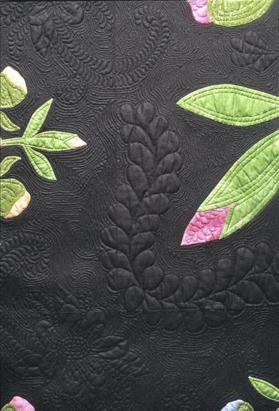 MIDNIGHT GARDEN Midnight Garden is a Medallion Rose of Sharon quilt with smaller versions of the medallion surrounding the center and small flower designs on the border. Appliqué is turn-under and applied by machine. Floral and feather motifs are quilted throughout. Quilting time alone was 84 hours of intense work by machine. Piping sets off the binding and brings everything together. Midnight Garden gives the viewer different perspectives when viewed from a distance and up close. At a distance one sees the overall design of the quilt which gives the viewer the feeling of seeing a beautiful flower garden while meandering along a pathway at midnight. Up close the viewer is treated with the masterpiece of quilting that went into this magnificent quilt. Price: $3,500 |