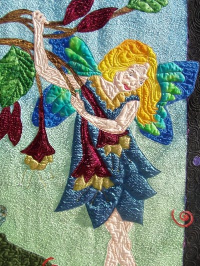 ONCE UPON A TIME The background is a hand painted color-wash of blue melting into green. Couching and piping with nontraditional fabrics add to the appearance of this lovely wall hanging. This wall hanging would go well in a child’s room or on that wall needs a special look. Price: $2,500 |
