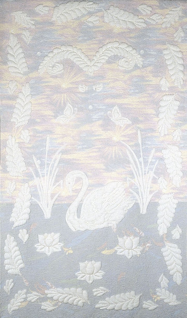 SERENITY As the name implies, Serenity has the calming effect of early morning at its best with nature kissed by dew. Over seven thousand hand-sewn beads give the effect of early morning dew. Shadow work along with trapunto gives this special quilt a very serene effect. Note the fish swimming in the background underneath the serene swan, an effect created by shadow work. This quilt is a masterpiece that will be an heirloom treasure in your home. Price: $4,000 |